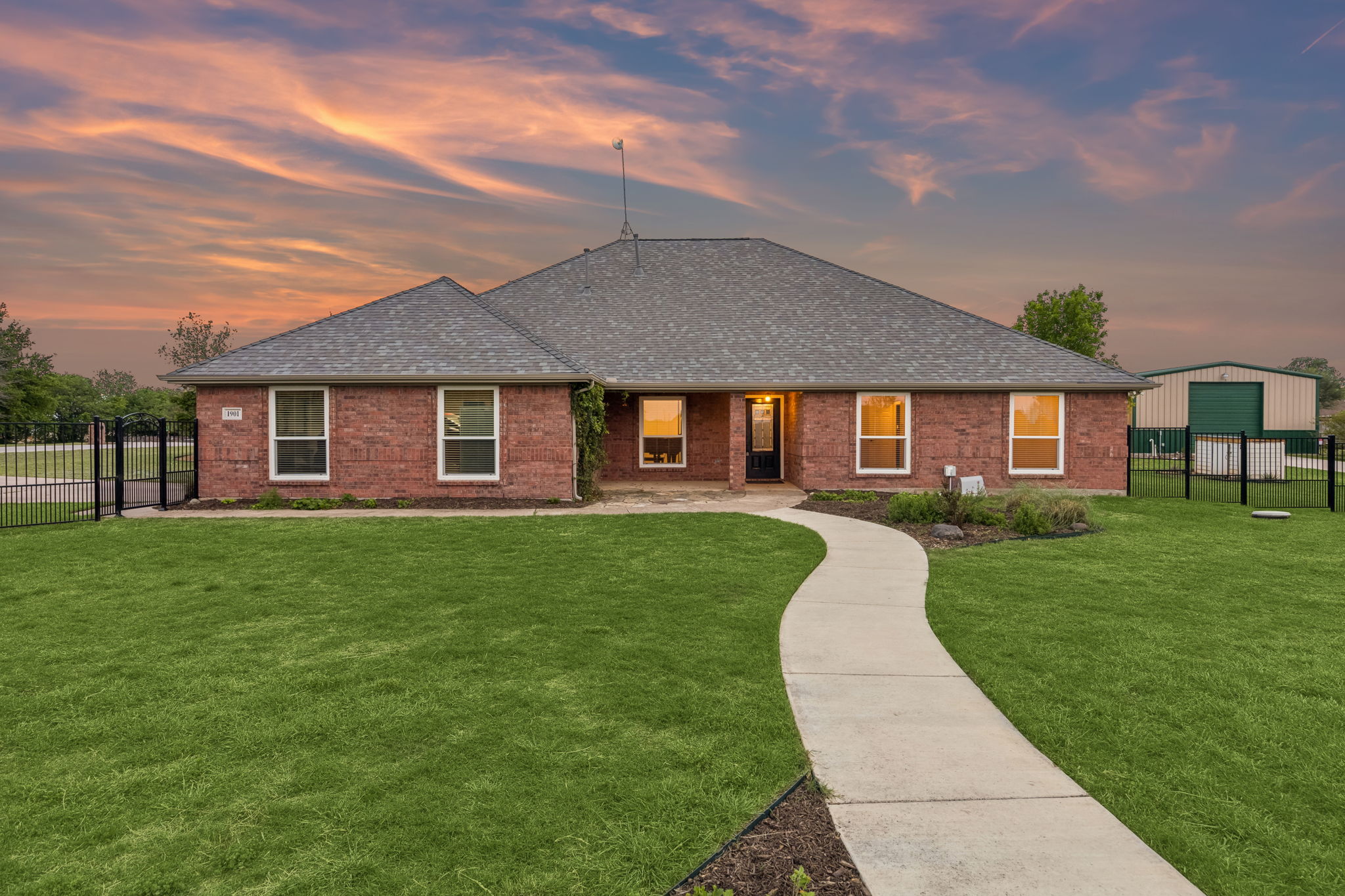 Perfectly situated on a fabulous corner lot in the highly sough after community of Sun Valley Estates, this meticulously maintained property has it all. A stunning, elevated homesite framed by extensive manicured landscaping & a classic wrought iron fence. The expansive green space, gardens, & serene sunset views offer the perfect backdrop for outdoor living and show pride of ownership. Main home features 3 generously sized bedrooms, a lovely secondary bath & wonderful storage. The Spacious primary suite features warm wood flooring, vaulted ceilings, & abundant natural light. Spa-inspired primary bathroom featuring dual vanities, a relaxing jetted soaking tub, glass-enclosed shower, & oversized walk-in closet. Beautifully updated kitchen showcases custom-painted cabinetry, rich granite countertops, and a modern mosaic backsplash. The thoughtfully designed layout offers a center island, abundant storage, and seamless connectivity to the main living space—perfect for both everyday living and effortless entertaining. The living room is anchored by a warm brick fireplace and expansive windows that fill the room with natural light. The open-concept design flows effortlessly into the dining area, while durable tile flooring and neutral tones create a timeless, comfortable setting for both relaxing and entertaining. A secondary living space is a wonderful option for a formal den or home office. Impressive, oversized shop measuring approximately 30x52, offering exceptional space for a workshop, storage, or hobby use. The shop includes a private half bath for added convenience and functionality, a 12-foot door, & two 50 Amp plugs for RV & hot tub. Attached is an expansive covered patio/overhang, creating the perfect setup for outdoor workspace, equipment coverage, or shaded entertaining. This property offers ideal country living while still having easy access to shopping, dining, & entertainment. Zoned to Award Winning Northwest ISD Schools this home is truly a must see.
