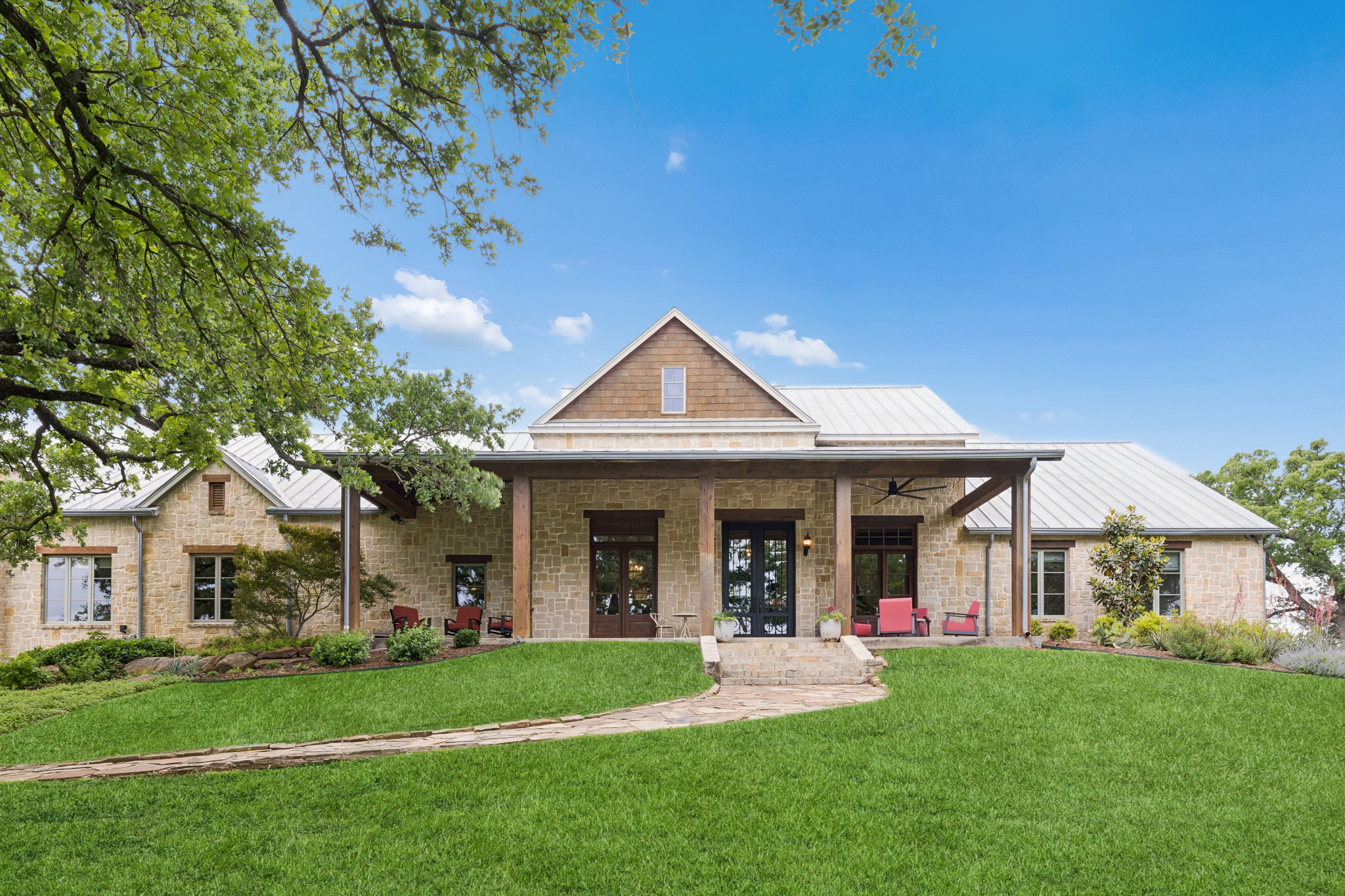 From the first approach, the residence makes a lasting impression with its timeless stone exterior, warm wood accents, metal roofline, and welcoming front porch that captures the spirit of refined country living. Inside, rustic elegance meets modern comfort. Soaring spaces, natural light, rich architectural detail, and an open-concept design create a home that feels grand without ever losing its sense of warmth.